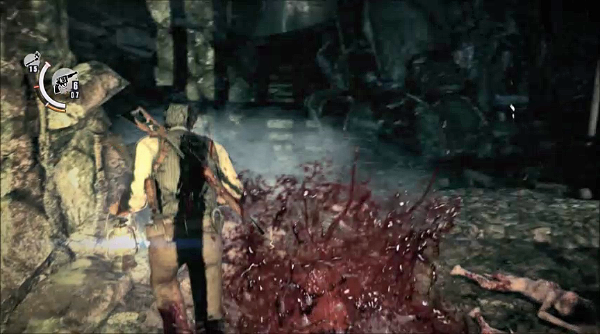 This is the section after the one where you get the cutscene with the two villagers that turn into Haunted. After you get past this part, there is this vast open area with a few ruined houses and several Haunted patrolling the field. There are way more zombies in Akumu than in the lower difficulties, and moreover they are much more agile and can sense Sebastian way easier and faster. A serious disadvantage for Sebastian here is that the pistol that he found earlier has very little ammo in it, but this is only a minor reason why you shouldn't use it. The main reason is that the slightest gunshot will attract the attention of all the zombies in the area and Sebastian will be swarmed. To make things worse in this part, accidentally stepping on a bear trap equals instant death.
